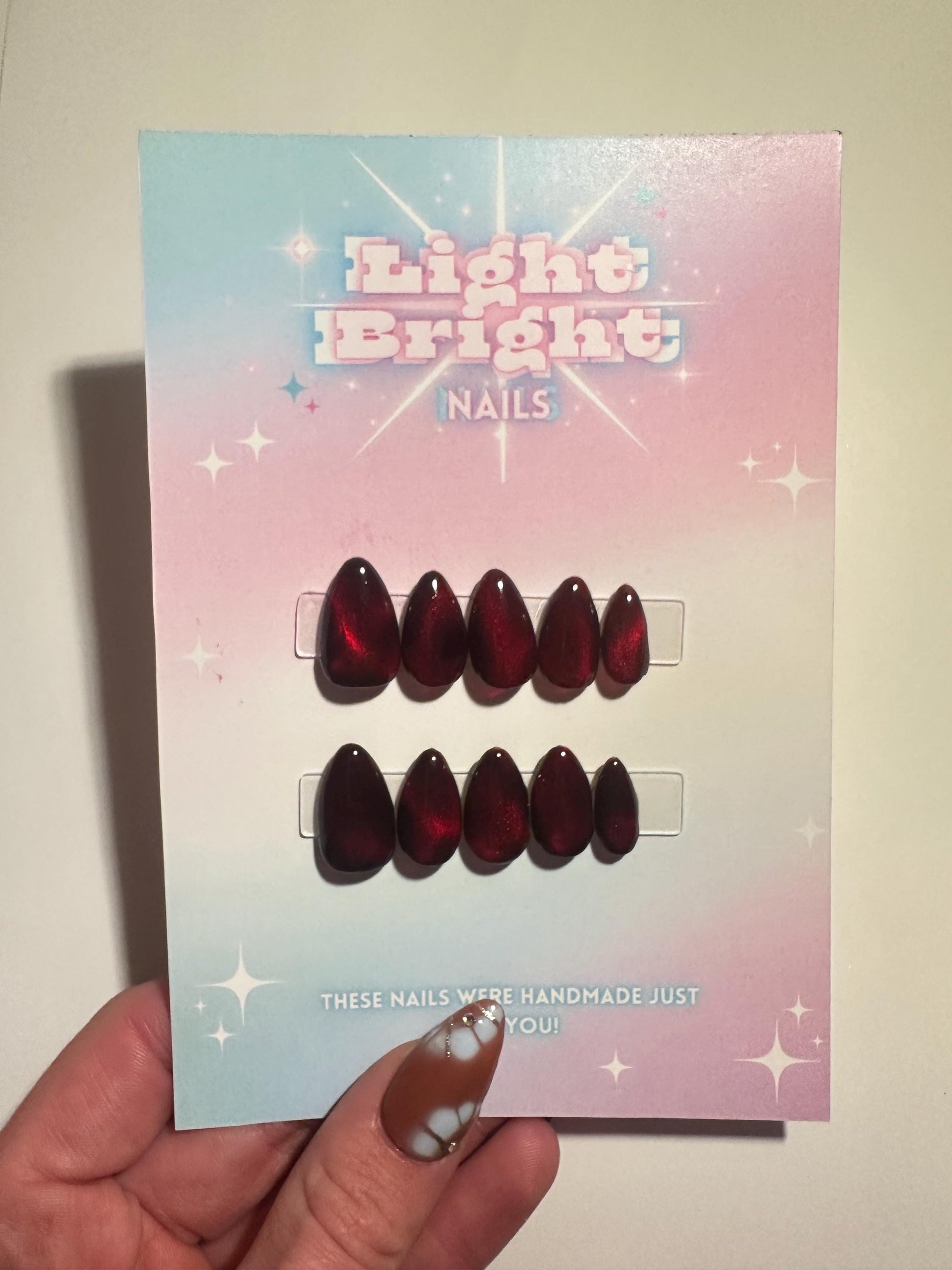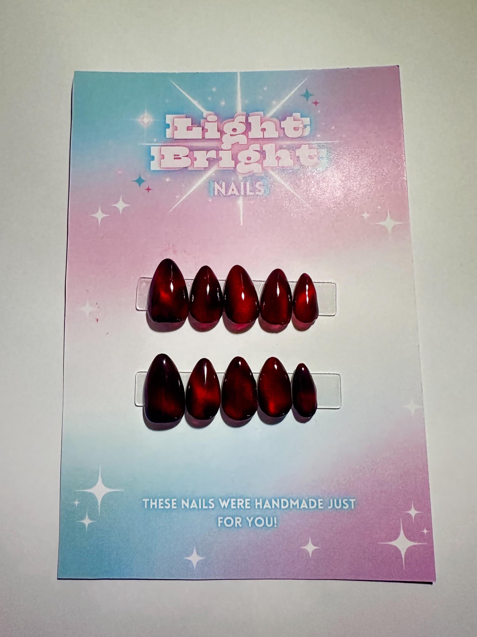 Red Lights are here to bring you a taste of the dark side. Complete with a silver cat eye and jelly red polish this set is made to make you feel something.