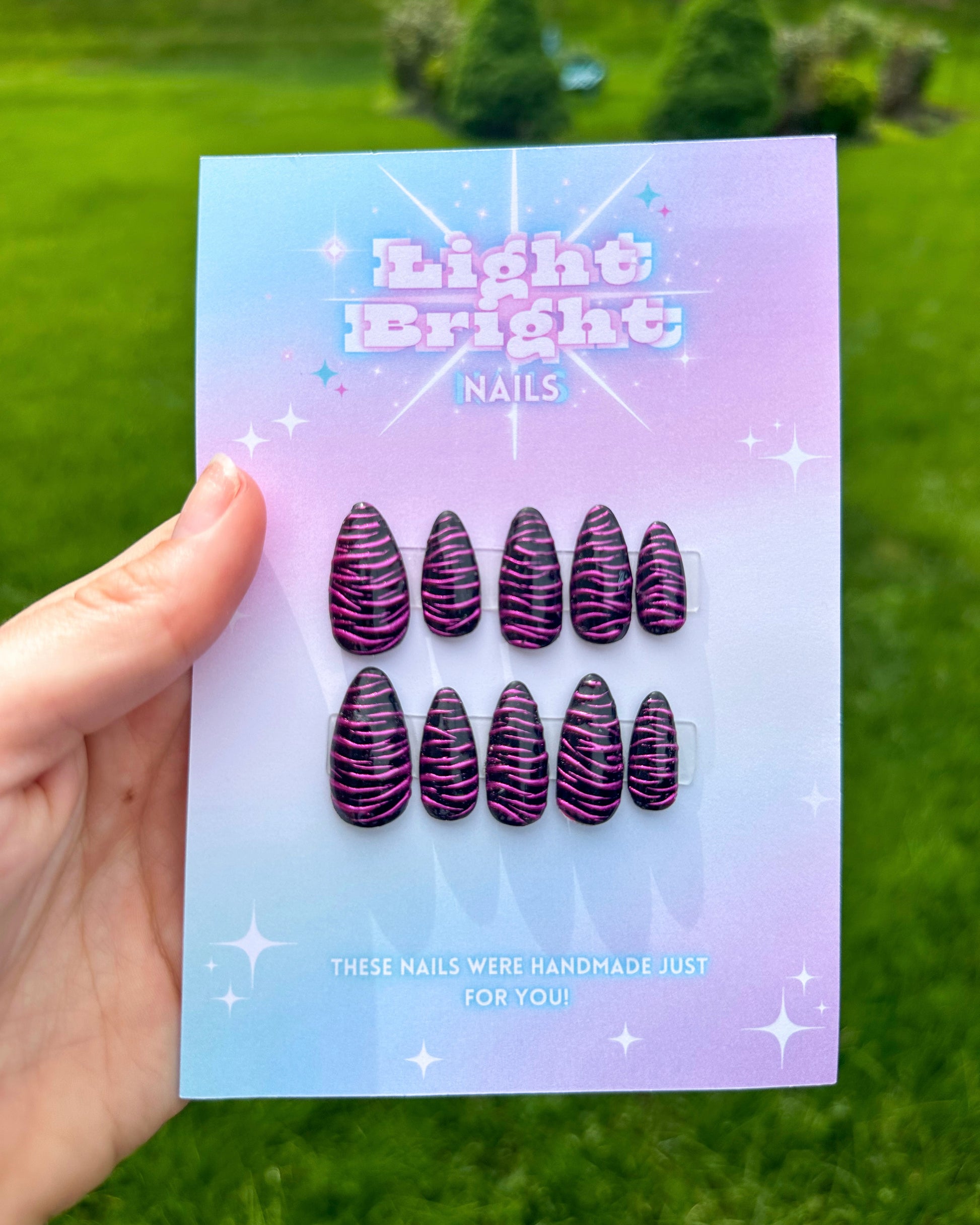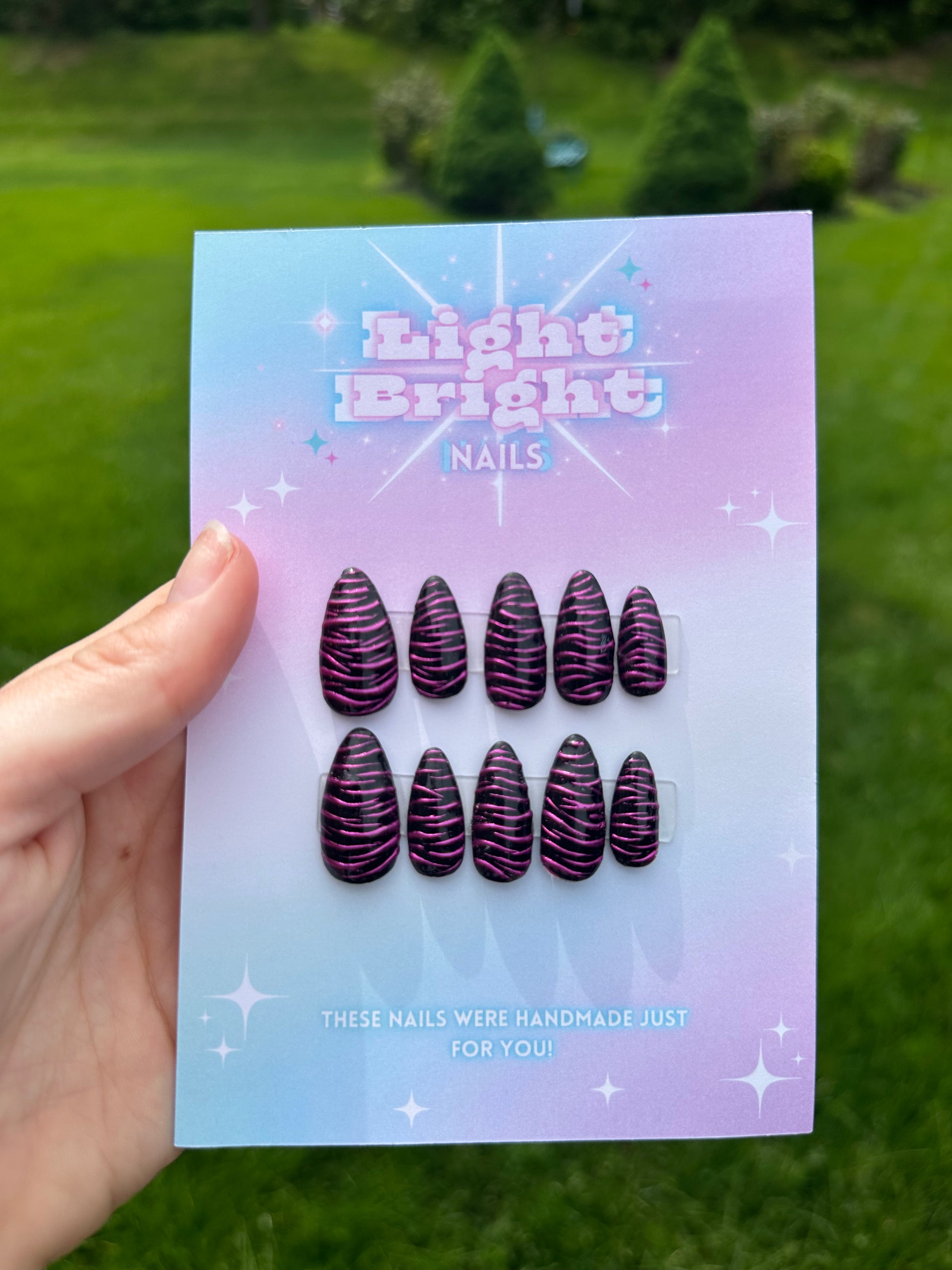 These zebra print chrome nails are so fun and customizable! Simply pick your favorite chrome color and decide if you would like glossy or matte finish.*